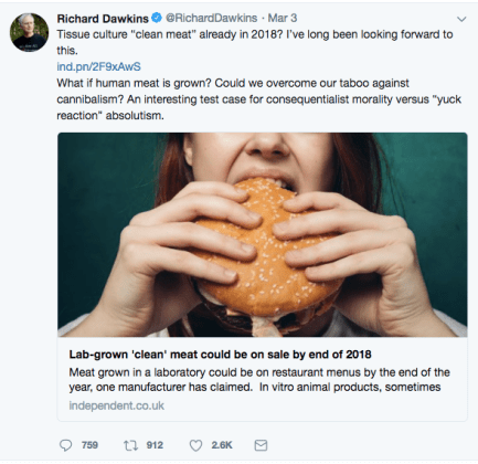 I recently read a news article claiming that Richard Dawkins was now promoting cannabilism. It’s based on a tweet from March 3rd referring to an article in the UK’s Independent about research turning livestock stem cells into what they called “clean meat” and of the possibility this lab grown meat could be onsale by the end of this year.