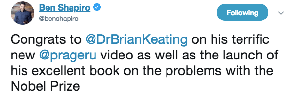 Gotta say “Wow!” here. I was looking at my timeline a few minutes ago and a bit earlier I had commented on a tweet I had seen congratulating Professor Brian Keating on his video at PragerU. Well, I had just completed a few hours earlier a takedown of an article I had seen about it. The “Wow!” isn’t about my post but about the tweet I saw, and my response to it.
