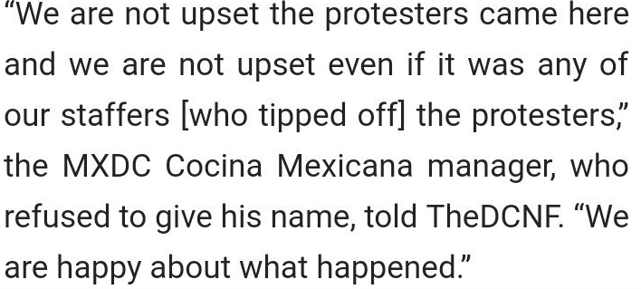 If I were a patron of that restaurant, I’d probably not ever darken their door again. Why would they allow a disruption like that? It doesn’t just affect the person they were protesting but all customers. Management could have insisted the protestors leave the establishment. Once on a public sidewalk, they could do as they please.