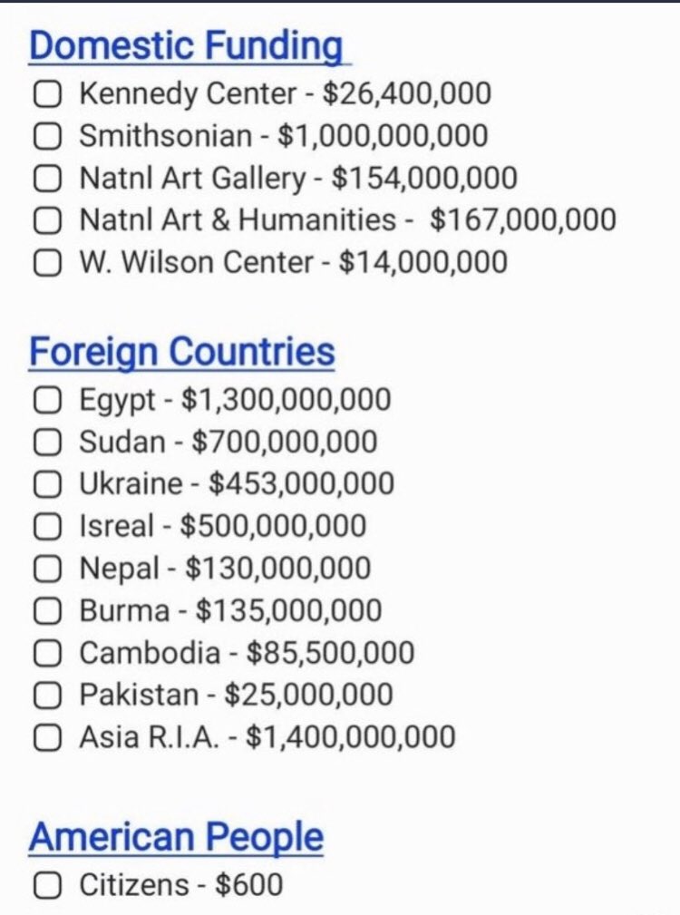 Just look at all the money spent on other things though. Some people online today have tweeted out lists of where large chunks of the money is going. Again, not to you. I found this on Twitter. Of course some of this comes out of the Budget bill (e.g. foreign aid) but the question is why were spending so much there and so little on the suffering American people: