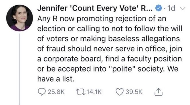 We have a list. We are coming for you if you happen to disagree with us. This has actually been coming for a while and now that the left has control of both houses of Congress, along with the White house (for at least two years)we can expect more of the same. Social media platforms like Twitter, Facebook, and Instagram have no fear from their good friends in Congress with being regulated now.
